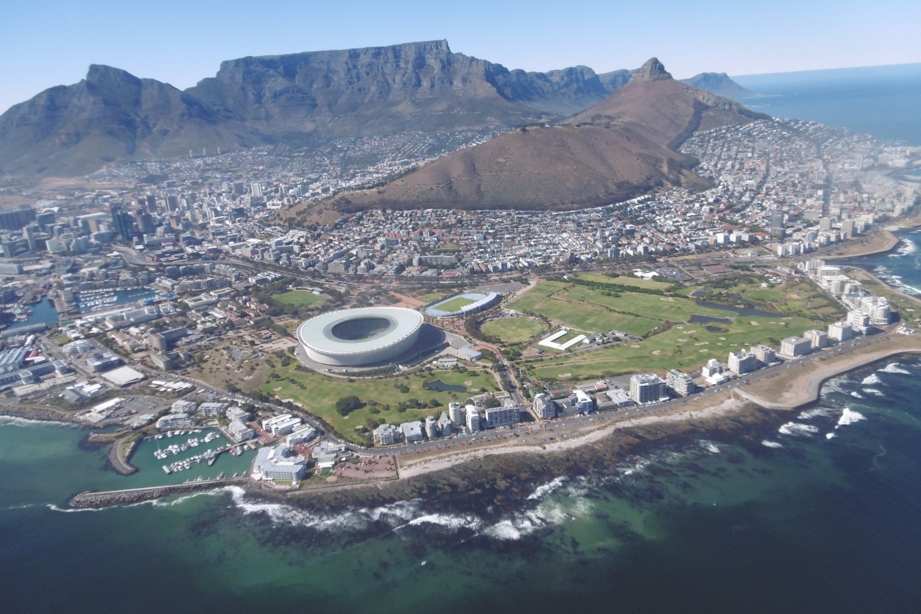 Der gut zwanzig minütige Flug führte vorbei am Finalstadion der WM 2010, dem Tafelberg, dem Hafengebiet von Kapstadt sowie Robben Island, welche eine Gefängnisinsel war. De berühmteste Insasse hieß Nelsen Mandela. Abgerundet wurde das Ganze mit einem Glas Champagner nach der Landung. Von dort ist es auch nicht weit zur Waterfront, welche zum Spazieren und Flanieren einlädt. Neben den Startplätzen für Helikopterrundfüge besteht hier die Möglichkeit, auch Bootstouren zu unternehmen. Wer es entspannter angehen möchte kann hier ein Theater, Aquarium, Brauerei oder Museum besuchen. Aufgrund des angrenzenden Hafens kann man natürlich auch in eines der Fischrestaurants einkehren und frischen Fisch genießen.