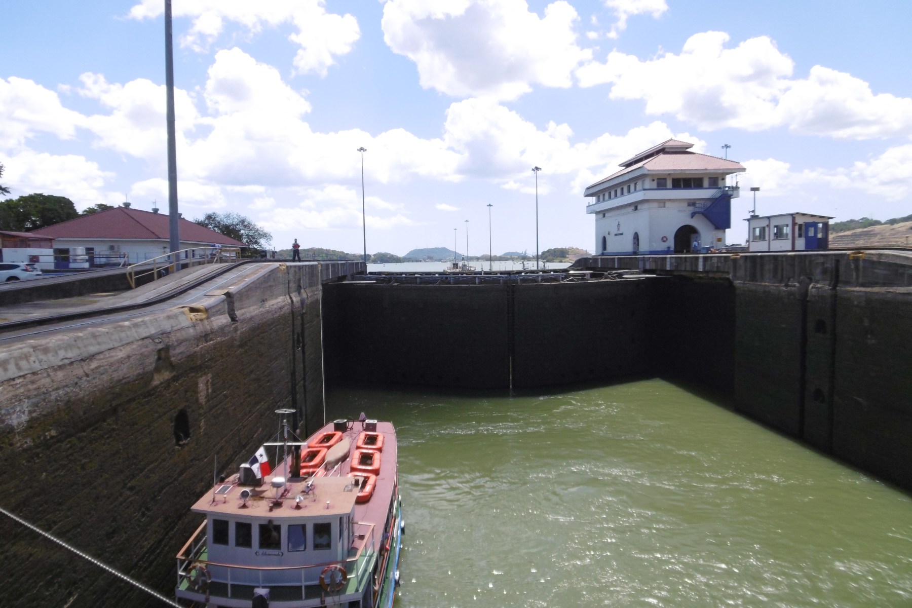 Der Panamakanal hat 3 Schleusenanlagen, die für den Begegungsverkehr und als Vorsorge jeweils paarweise angelegt ist. Die MS Albatros begann gegen 8 Uhr mit der Einfahrt in den Kanal von der pazifischen Seite. Nach einer 1 ½ Stündigen Fahrt erreichten wir zuerst die alte Miraflores-Schleusen. Bei dieser sind zwei direkt aufeinanderfolgende Schleusenkammern und mit einem Hub beziehungsweise einer Fallhöhe von insgesamt 16,5 Metern zu finden. Die Mirafloresschleusen müssen einen Höhenunterschied zwischen Mindestens 13 Metern und höchsten 20 Metern überwinden. Nach dem unser Schiff einige Meter nach oben befördert worden ist, geht es nur wenige Meter entfernt in die Pedro-Miguel-Schleusen. Sie verfügt nur über eine Schleusenkammer und einer Fallhöhe von 9,5 Meter.